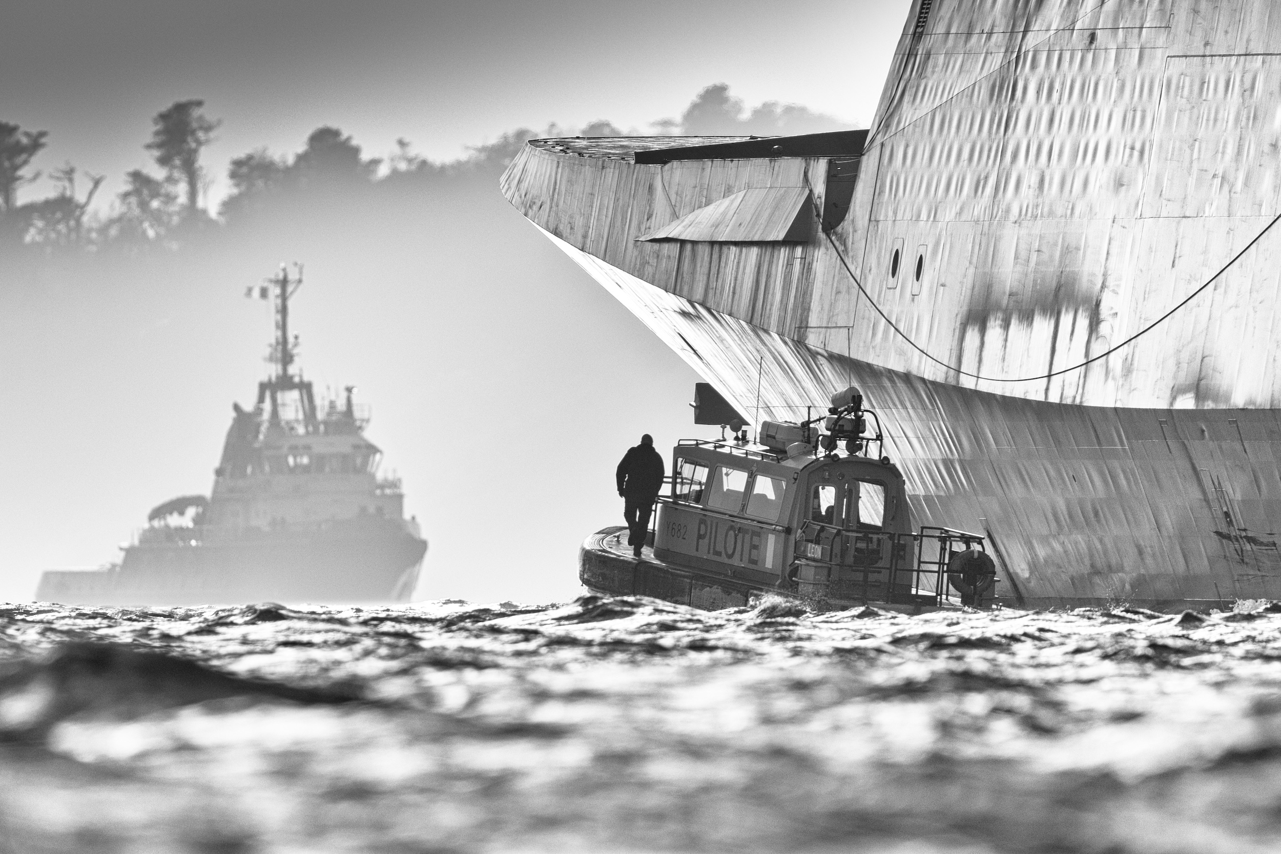 Je laisse passer la frégate, en prenant cette fois-ci le 300 mm : une bien jolie scène s’offre à moi avec le ballet des marins du pont. Gourmand, je tente de nouveau une passe photographique en laissant le géant me venir dessus et tenter un cliché au 28mm. Quand la frégate arrive à moins de 100 mètres, je ne suis plus sûr de moi du tout et j’abandonne l’idée. Piloter mon embarcation seul et shooter au grand angle en même temps n’est pas un sport de masse et les conditions ne sont pas si clémentes…