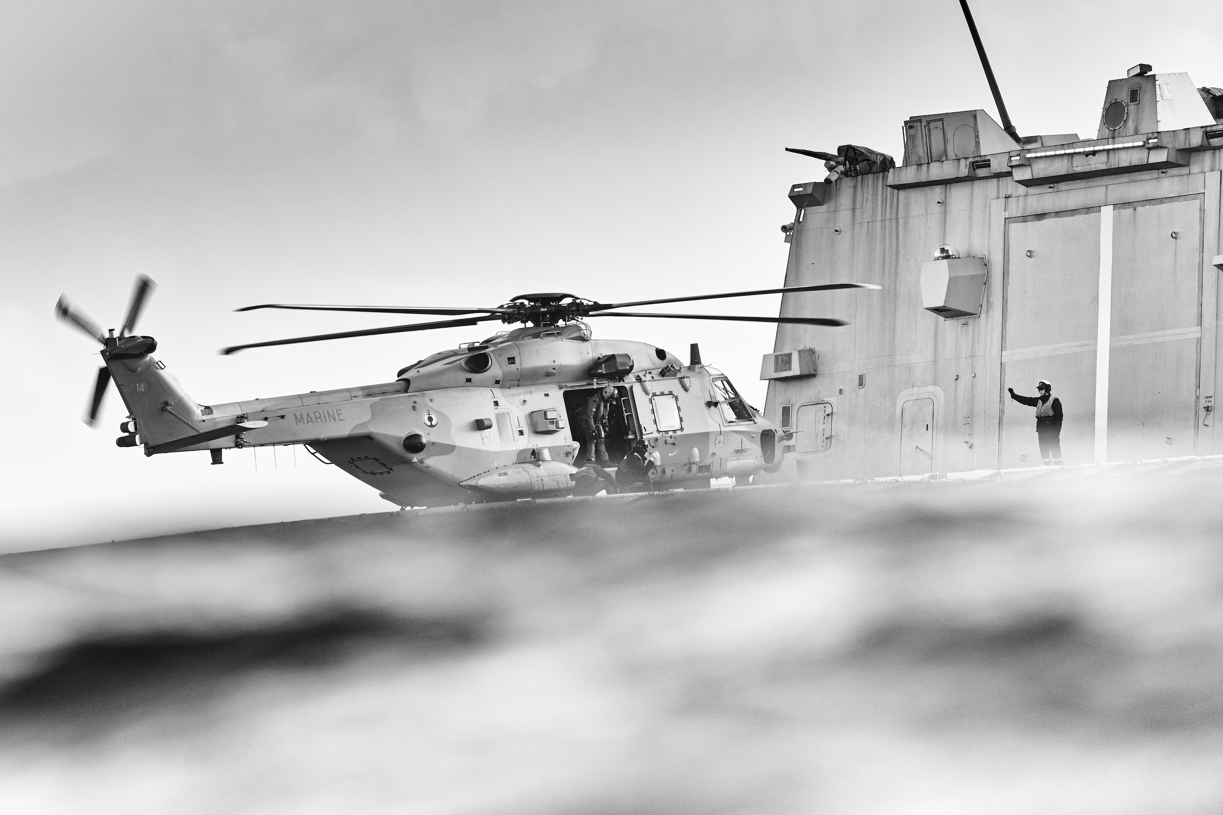 La tension monte à bord de ma petite embarcation. Je suis seul, mais diablement excité ! Je pense tout de suite au cliché que j’avais fait quelques années auparavant sur la FREMM *Normandie*, qui avait également récupéré son aéronef ; j’avais saisi la scène à la perpendiculaire, et le cliché se trouve actuellement en très belle place au musée de la Marine, à Paris !