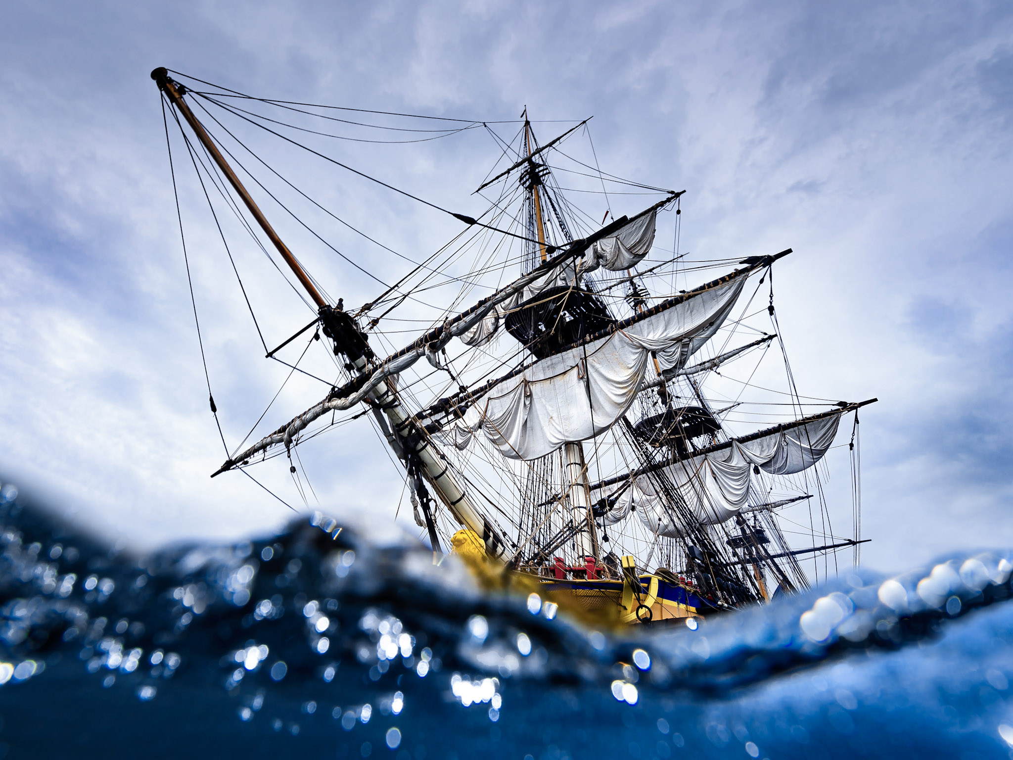 Alors forcément, lorsque plus tard je croise la route du fier vaisseau àBrest, je fais feu de tout bois pour tenter l’image. Une atmosphère fantasmée naît dans mon esprit : celle d’une scène parfaite, où j’invite l’Hermione à entrer dans mon univers, celui de la photographie et de la lumière studio.