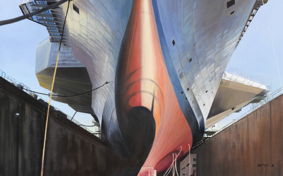 Dernièrement, dans les bassins Toulonnais, Michèle a profité de l’arrêt technique majeur du porte-avions Charles de Gaulle pour le croquer au cœur de la forme Vauban. Plusieurs années en arrière, j’avais photographié cette même scène. La magie de la peinture, c’est de pouvoir s’affranchir des contraintes techniques. Ici, les pinceaux permettent d’embrasser l’ensemble de la perspective du bateau gris, de sa largeur importante et de son gigantisme vertical, de la proue au pont d’envol et ce, en l’absence de recul ! Cette oeuvre est « peinte » au 70mm, fantasme pour le photographe…