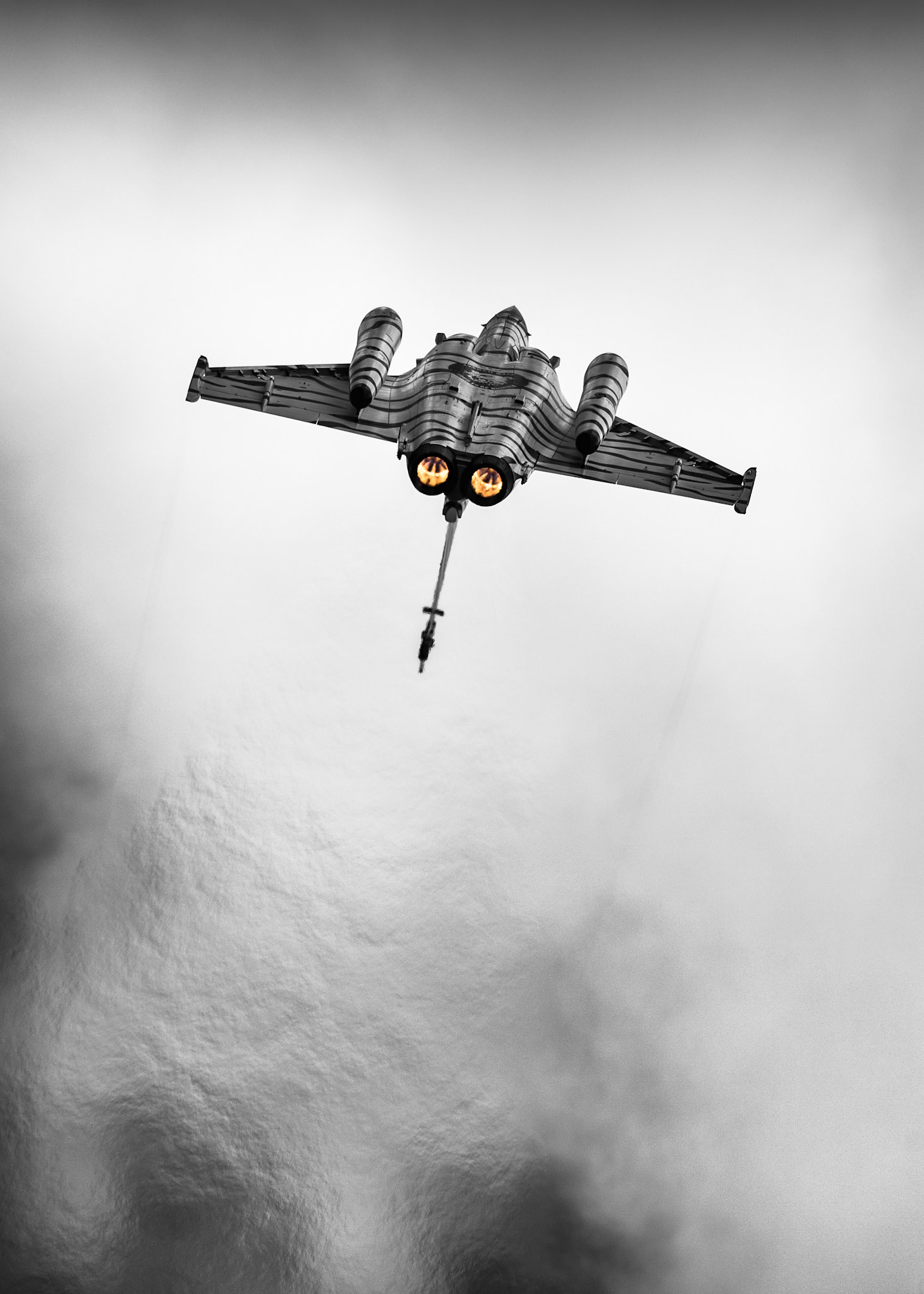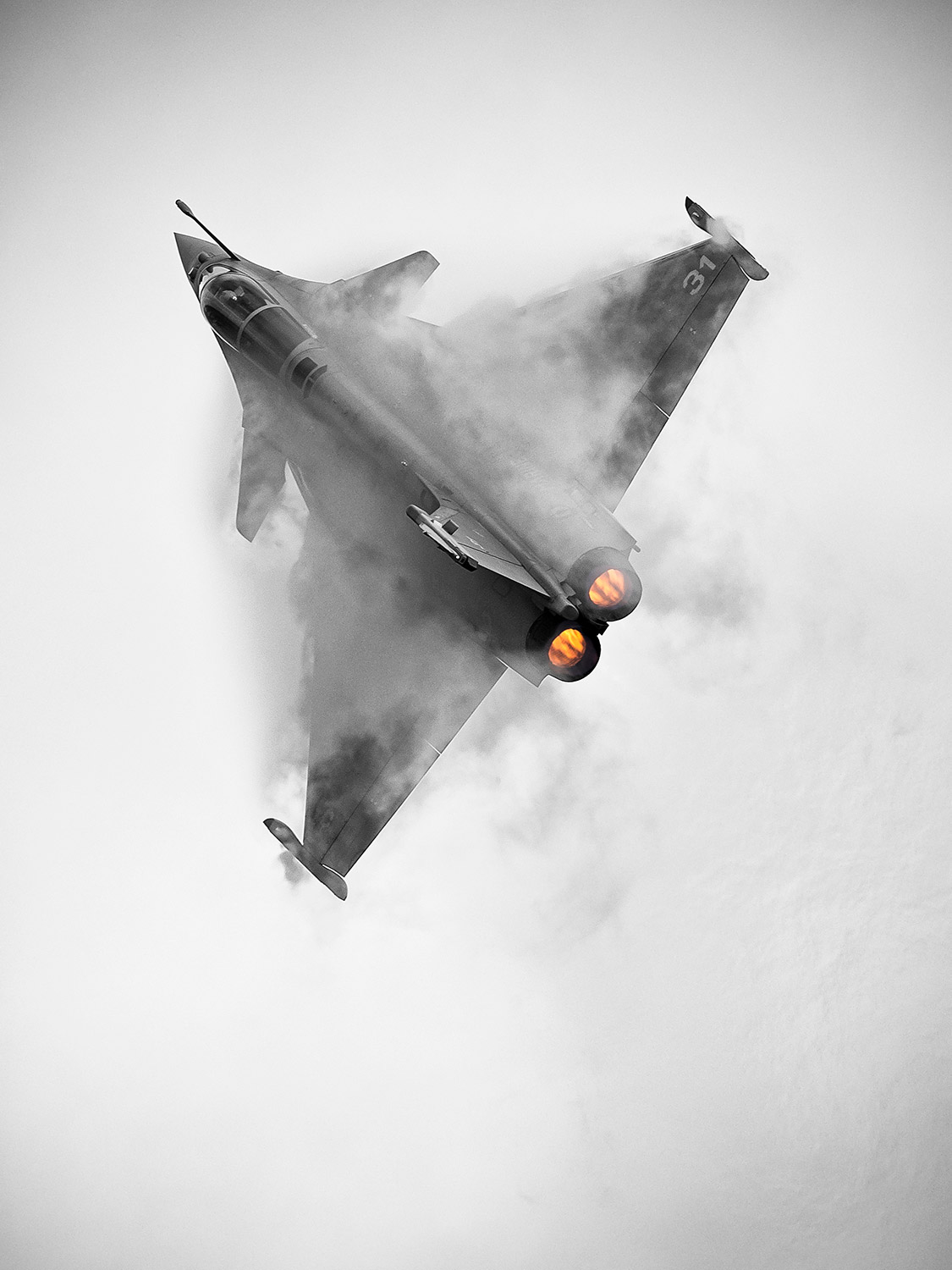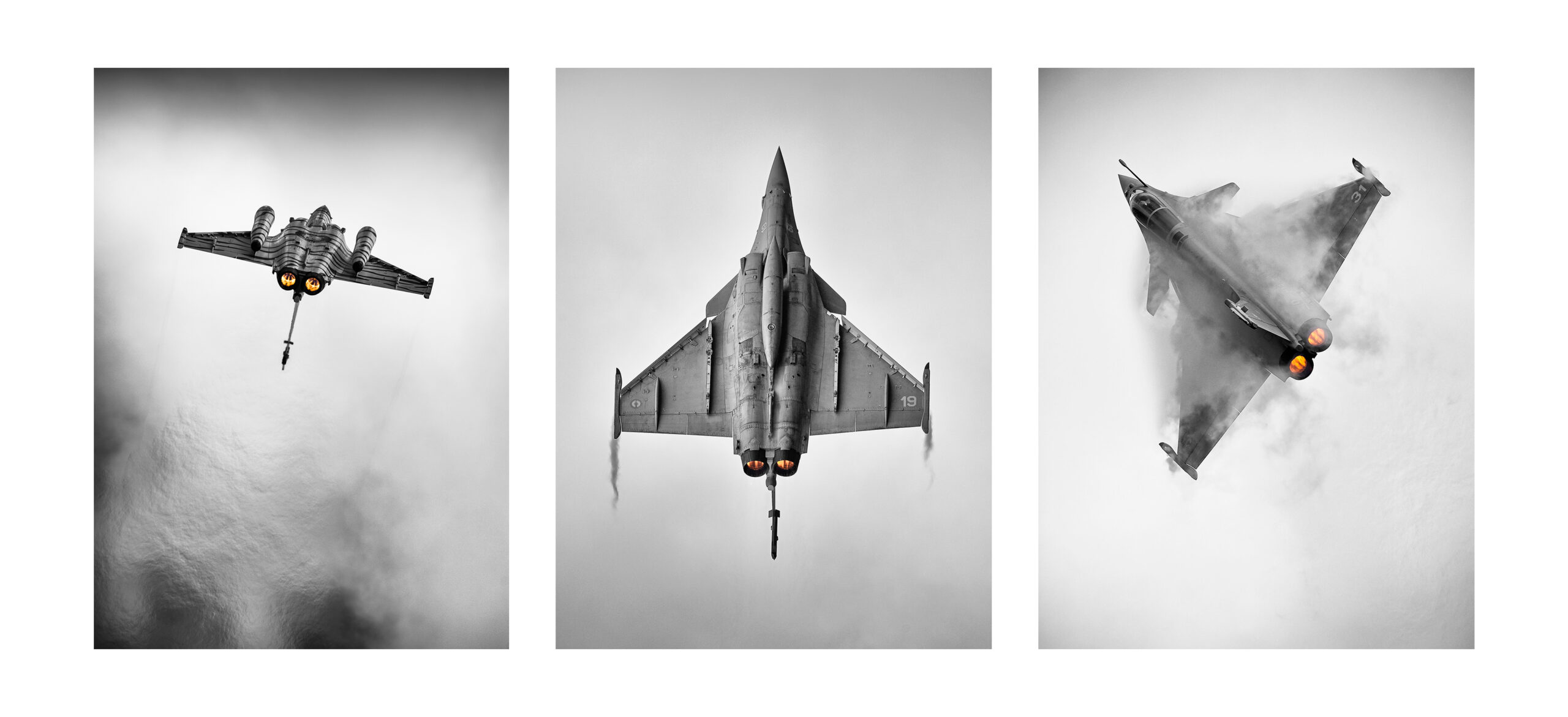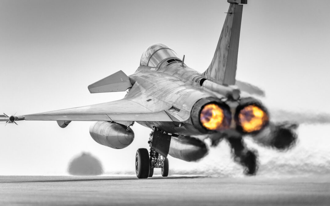 Chaque phase, chaque posture sont une prouesse que le rafale marine provoque avec technicité et esthétique. La post-combustion, qui naît d’une pulvérisation de carburant pur enflammé par une tuyère brûlante, devient un feu sacré qui propulse le pilote dans des cinématiques improbables ou la notion d’horizon n’est plus qu’un vague concept pour terriens…