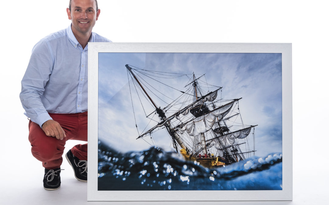 J’ai répondu à la thématique proposée pour le salon par une œuvre nommée « Guerrière océane ». Elle représente la frégate Hermione en contre-plongée aquatique, ciel chargé, déroulant ses voiles tannées par le temps, le sel et le soleil. Ce cliché fait suite à une série « Périscopes » entamée il y a quelques années maintenant…