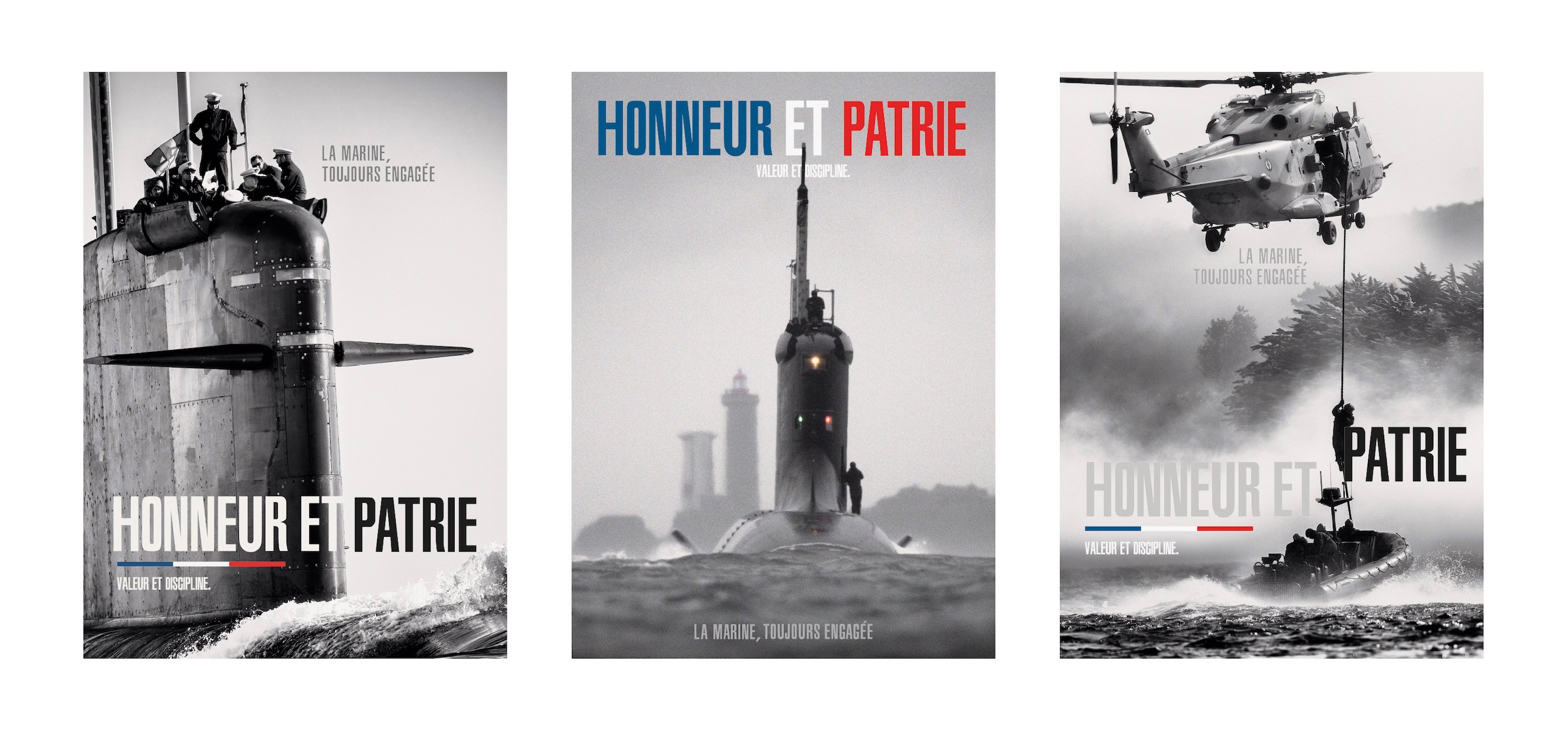 À partir de cette photographie, Geoffroy Renard imagine la direction artistique de l’affiche. Son travail révèle ce que l’image murmure déjà : l’engagement discret, la fierté de servir, la permanence d’une mission. Cette réflexion graphique et symbolique conduit à mettre en lumière deux mots emblématiques : Honneur et Patrie, ainsi qu’une formulation repensée du slogan : « La Marine, toujours engagée. »