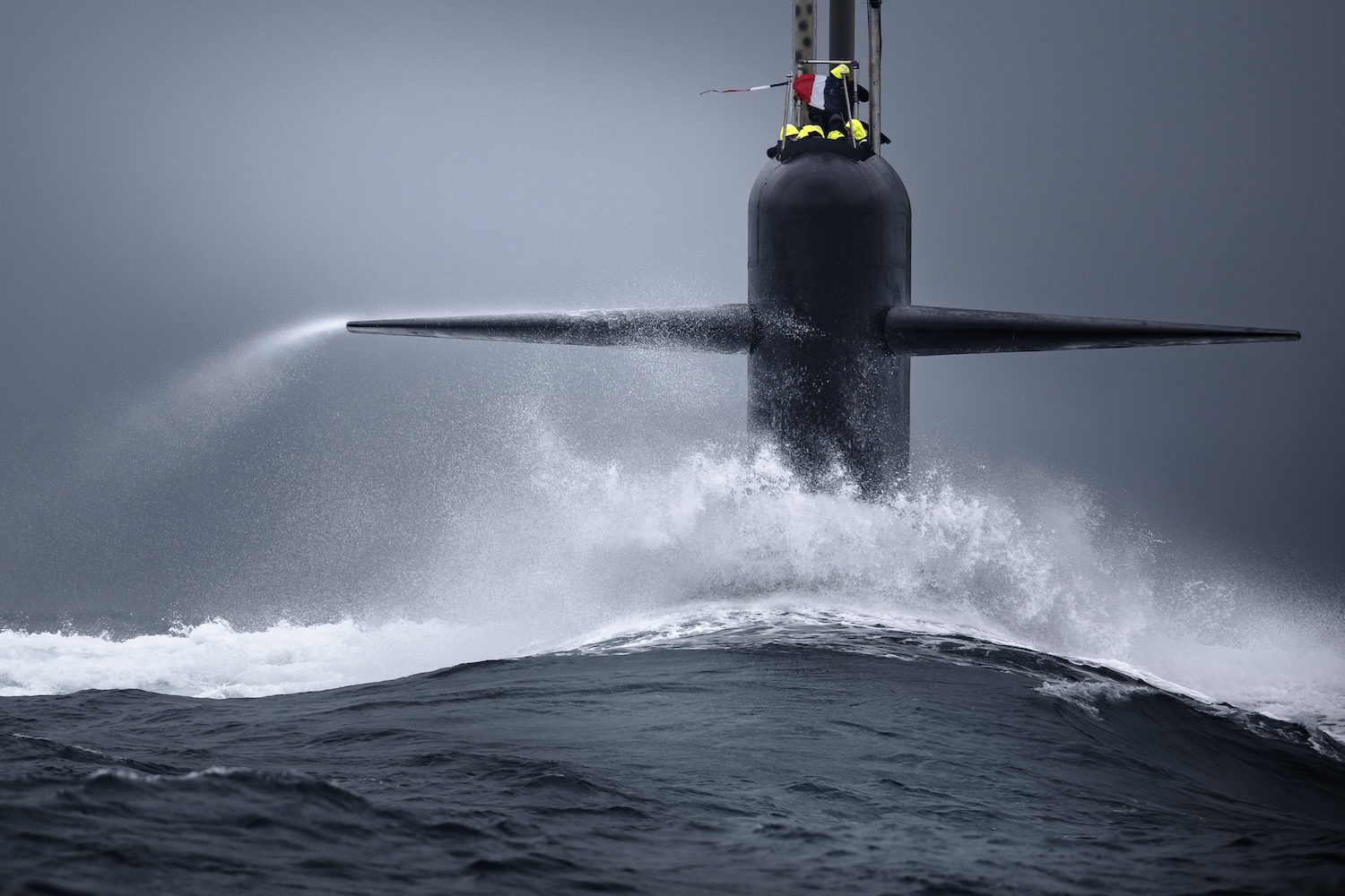Je décide d’attendre que la fin du grain arrive et j’imagine que dès que le soleil percera, les conditions seront réunies pour déclencher. Conserver mon avance sur le SNLE de 14 000 tonnes lancé à plus de dix noeuds se relève très chaotique. Mais l’excitation du cliché unique est plus forte.