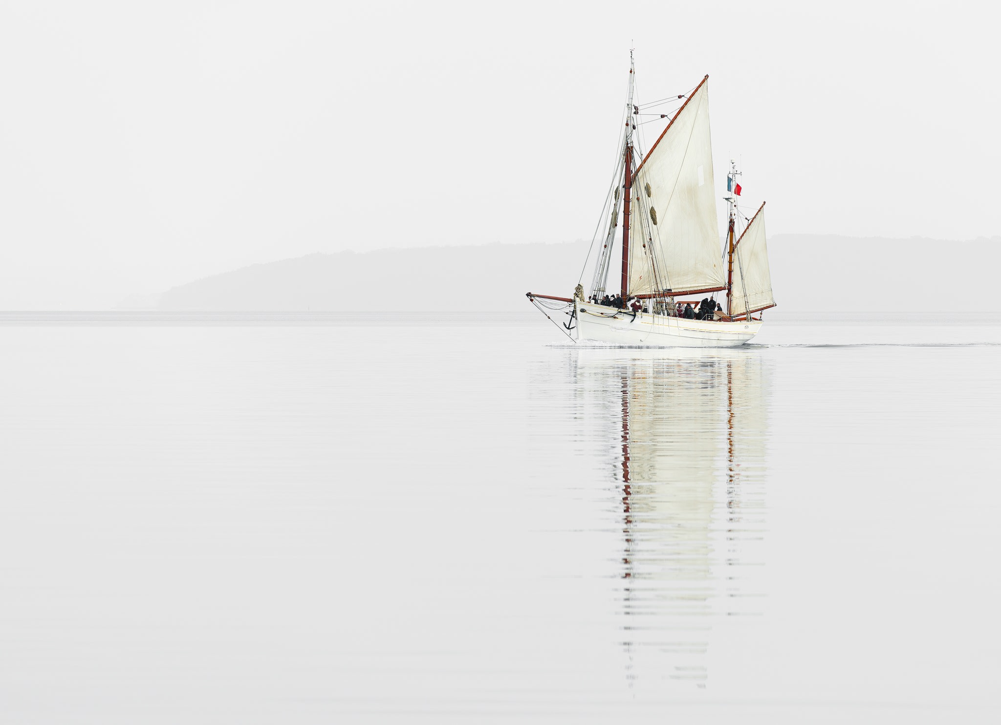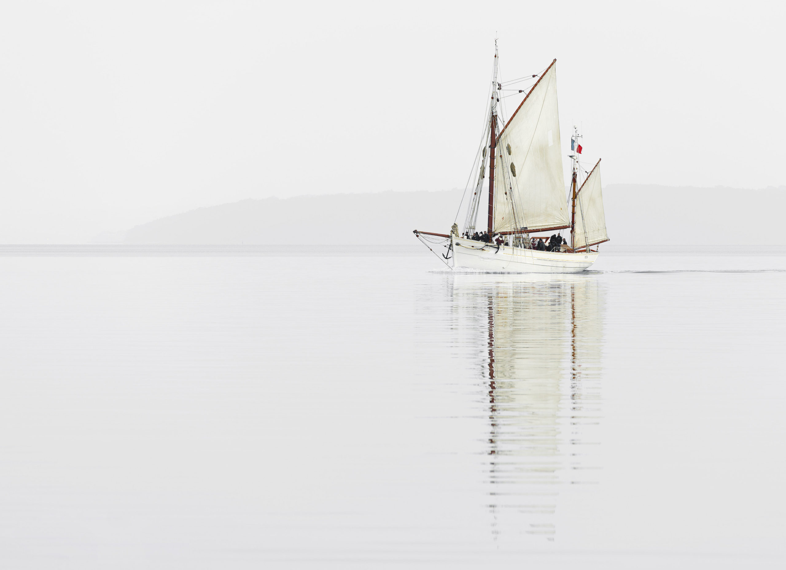 Rade sud de Brest, un matin de février, la pétole est insallée. Au fond de la rade, sur les rivages de Crozon, le vent commence doucement à iriser le plan d’eau. L’ambiance est si feutrée que la photographie se transforme allégrement en aquarelle autour du cotre Dundee « Le Mutin ».