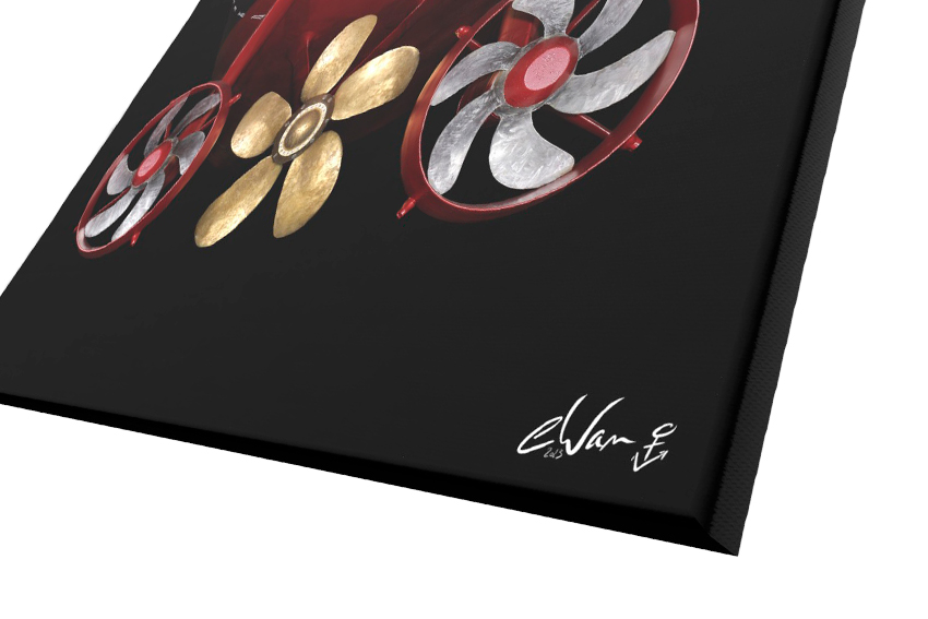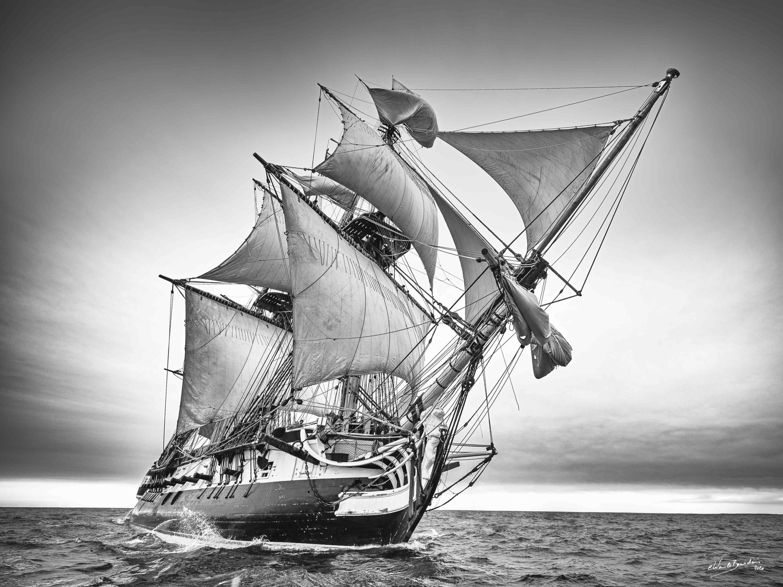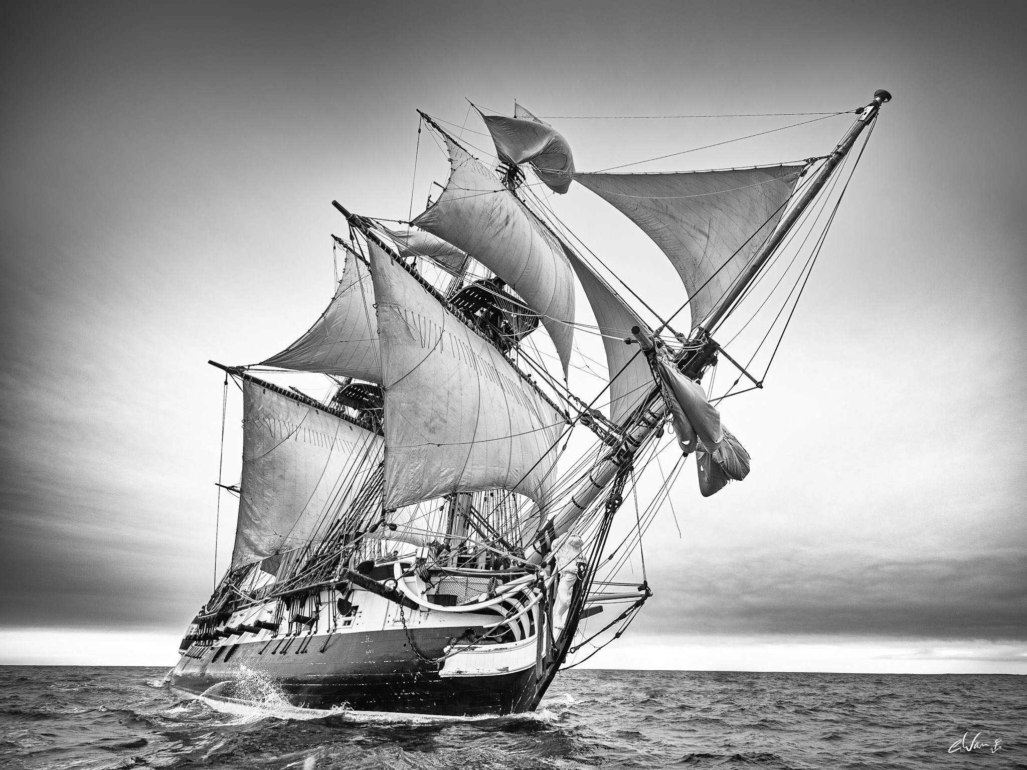 Les reproductions sont signées de manière discrète directement sur la photographie, comme ici sur l’Hermione en bas à droite